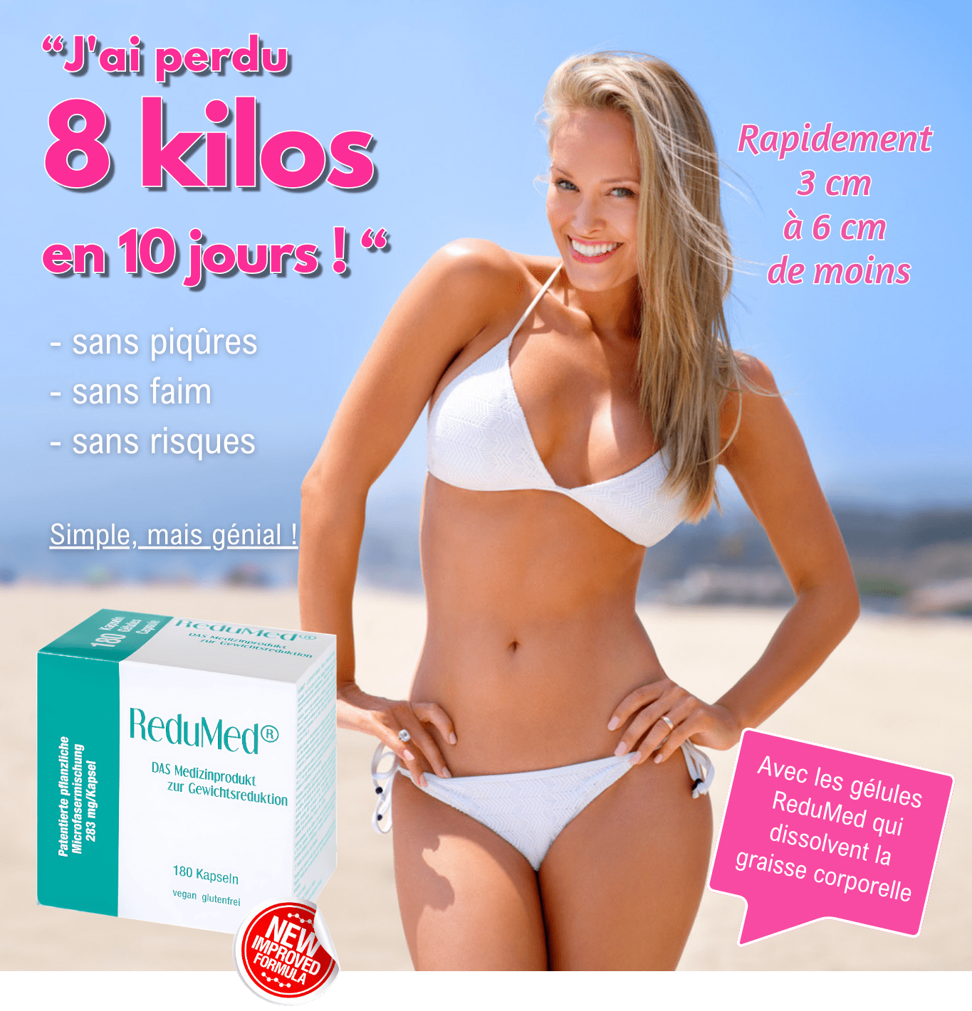 La super nouvelle pour tous ceux qui ont trop de kilos sur la balance et qui veulent maintenant perdre du poids sainement sans méthodes torturantes. Elle s'appelle ReduMed, elle est testée médicalement et autorisée en Suisse, c'est pourquoi elle est disponible ici et dès maintenant dans toutes les pharmacies et drogueries.